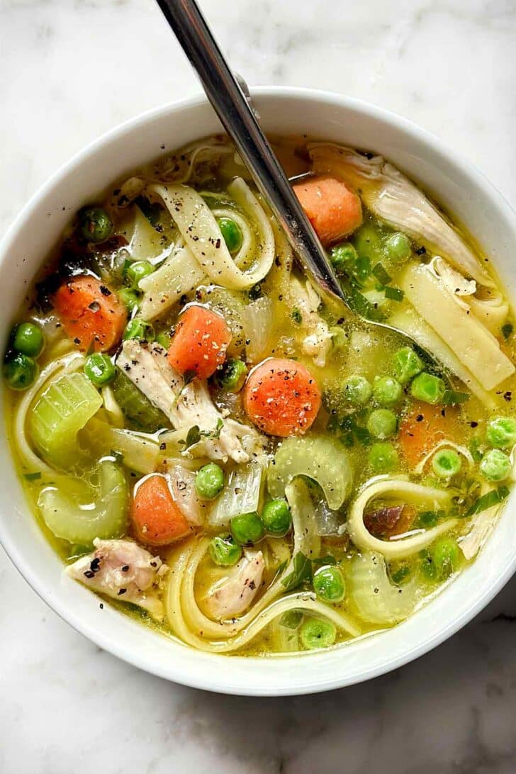 Lucky for me, last weekend I picked up a Costco rotisserie chicken, picked off all the meat, then used the carcass to make chicken broth that was now staring me straight in the face.