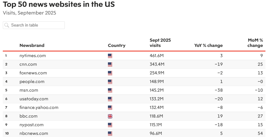 Welcome to this week’s Press Gazette Future of Media US newsletter on Friday, 10 October. 📱At Press Gazette we write all the time about the many ways publishers can engage with audiences in 2025. But one way that doesn’t come up much - yet - is text messaging. Politico started texting key updates to a pilot group of its core users on Capitol Hill this summer and it seems to be paying off. My favourite quote from my conversation with executive producer for Congress Zach Warmbrodt related to the “gut feeling” that helps editors decide when to send a text. “You know it when you see it – and when you see it, you have to send it.” I wonder if texting will become as ubiquitous as email newsletters, which several years ago were being treated to countless think-pieces about the potential of the low-tech medium - and now really are everywhere. Yes, push notifications already exist and can similarly get you to someone’s phone screen. But there’s something much more personal about actually being in someone’s inbox - and potentially getting a direct reply from them. 🤖 The final report from our Future of Media Technology conference last month looks at the value of The Washington Post’s Ask the Post chatbot. The questions asked by users in the chatbot help the Post discover angles the newsroom hadn’t actually considered yet, meaning it’s a useful two-way experience. For consumers, it was described as a passive, but interactive and hyper-personalised, experience that’s safer than the likes of ChatGPT because it’s grounded in the Post’s own reporting. 📊And it’s better news this month in our latest update on the top 50 news websites in the US. A busy news month in September, which included the assassination of Charlie Kirk, has led to a lot more growth than we saw a month earlier. The big winners in the top ten were NBC News, the BBC and CNN. Among the wider ranking, AP News, Reuters and Politico also saw strong month-on-month growth while Substack’s rise continues. 📈Top five on Press Gazette this week:1) Google appears to prioritise global newsbrands over local ones for breaking news eventsSEO expert explains why local news providers can “miss out” amid major news events. |
