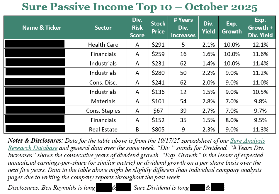 The image below shows key metrics for each of the October 2025 Sure Passive Income Newsletter Top 10.