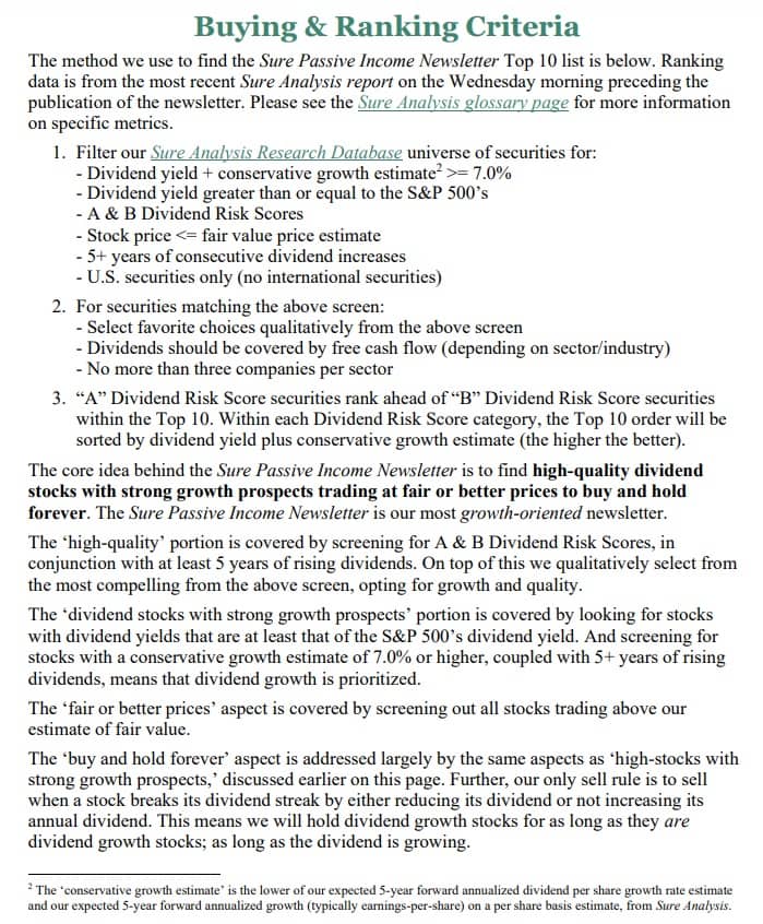 The Sure Passive Income Newsletter analyzes our current Top 10 buy and hold forever dividend growth stock recommendations for rising passive income. It's our most growth focused dividend growth newsletter.