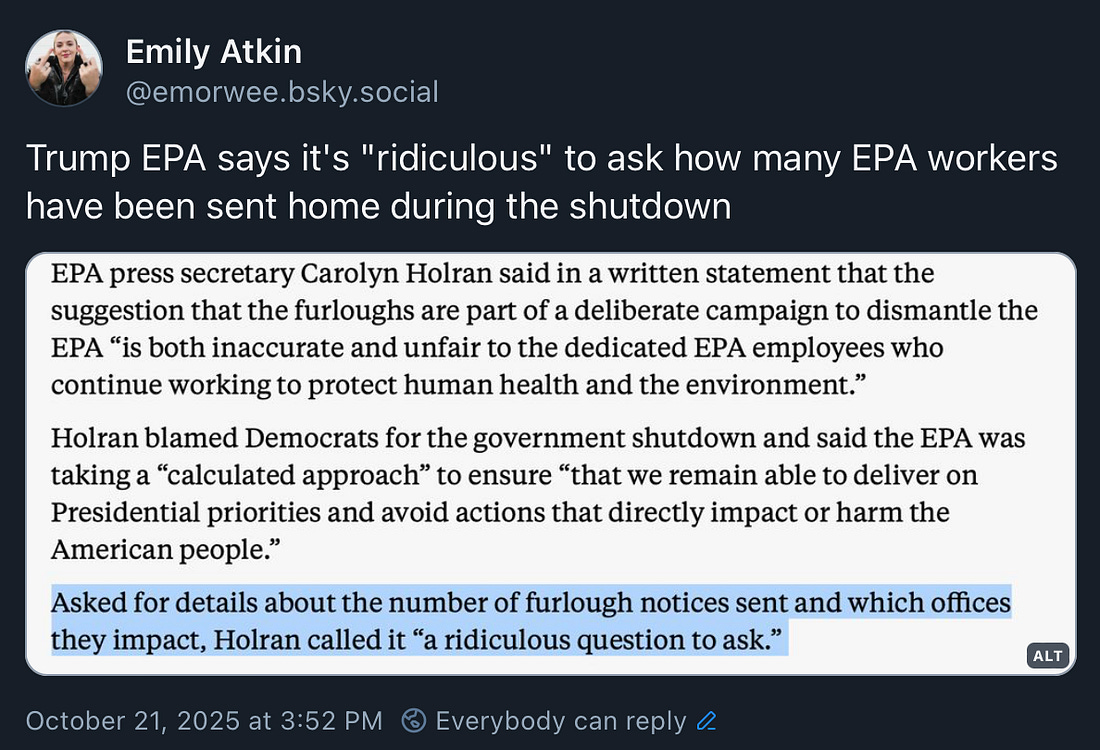 Welcome back to HEATED! I’m back from birthday break and ready to roll. Thank you so much for the well wishes and fantastic story ideas in last week’s paid subscriber forum. Also, on Friday (10/24), I’ll be at the annual Yale Global Justice Program Conference, speaking alongside Bill McKibben and Inside Climate News executive editor Vernon Loeb about the role, responsibilities, and challenges of environmental journalism today. You can find directions for registration and zoom links here. What’s “essential” to Trump’s EPA? More mercury pollution.As thousands of EPA workers are sent home during the shutdown, the ones dismantling mercury rules for coal plants are still clocking in.🌎 HEATED’s journalism is never sponsored, and never paywalled. That’s only possible thanks to paid subscribers. If you appreciate our fiercely independent coverage of climate and environmental issues, please support us. 👇 The Environmental Protection Agency’s work protecting clean air and water is grinding to a halt. As the government shutdown enters its fourth week, thousands of EPA workers are receiving notice they’ll be sent home. Furlough notices are “widespread” across the EPA, E&E News reported on Monday, “including a large percentage of staffers in EPA’s air and water offices.” The exact number of furloughed EPA employees is about 4,000, or about 27 percent of the agency’s workforce, Politico reported. The agency would not confirm or deny that number. (Asked for details about which EPA employees have been sent home, the EPA’s press secretary refused, telling Inside Climate News it was “a ridiculous question to ask.”) More employees are likely to be sent home as the shutdown continues. The Trump administration’s latest shutdown contingency plan considers nearly 90 percent of the EPA’s workforce to be “non-essential” or “partially essential,” and therefore eligible for furlough. “Many activities will halt, including research and the publication of research results, and the issuance of new grants, contracts and permits,” the Los Angeles Times reported. “Critically, civil enforcement inspections—on-site visits to facilities to check their compliance with environmental regulations—will also cease.” Furloughs are also just the latest blow to the EPA’s workforce. Before the shutdown, 4,000 EPA employees had already been fired or had taken a buyout. The agency’s climate offices and its scientific research arm are also in the process of being disbanded. And the bleeding is expected to continue if and when the government reopens; The Trump administration has proposed a 55 percent cut to EPA funding in its 2026 budget request. The detail was first reported Friday by Lisa Friedman at the New York Times. Des |