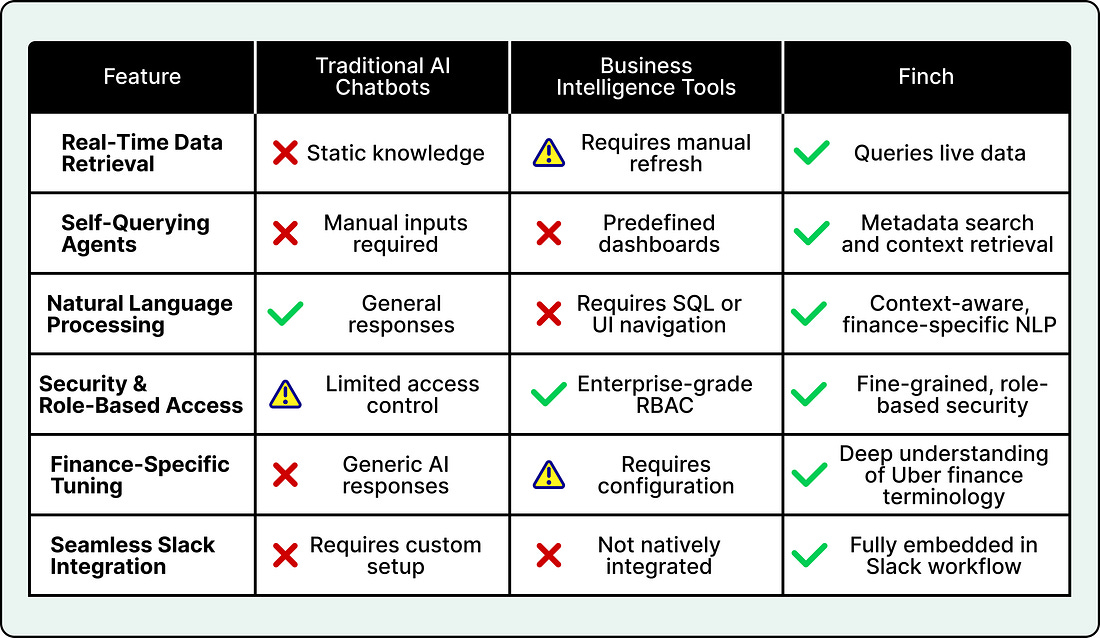 Stream Smarter with Amazon S3 + Redpanda (Sponsored)Join us live on November 12 for a Redpanda Tech Talk with AWS experts exploring how to connect streaming and object storage for real-time, scalable data pipelines. Redpanda’s Chandler Mayo and AWS Partner Solutions Architect Dr. Art Sedighi will show how to move data seamlessly between Redpanda Serverless and Amazon S3 — no custom code required. Learn practical patterns for ingesting, exporting, and analyzing data across your streaming and storage layers. Whether you’re building event-driven apps or analytics pipelines, this session will help you optimize for performance, cost, and reliability. Disclaimer: The details in this post have been derived from the details shared online by the Uber Engineering Team. All credit for the technical details goes to the Uber Engineering Team. The links to the original articles and sources are present in the references section at the end of the post. We’ve attempted to analyze the details and provide our input about them. If you find any inaccuracies or omissions, please leave a comment, and we will do our best to fix them. For a company operating at Uber’s scale, financial decision-making depends on how quickly and accurately teams can access critical data. Every minute spent waiting for reports can delay decisions that impact millions of transactions worldwide. Uber Engineering Team recognized that their finance teams were spending a significant amount of time just trying to retrieve the right data before they could even begin their analysis. Historically, financial analysts had to log into multiple platforms like Presto, IBM Planning Analytics, Oracle EPM, and Google Docs to find relevant numbers. This fragmented process created serious bottlenecks. Analysts often had to manually search across different systems, which increased the risk of using outdated or inconsistent data. If they wanted to retrieve more complex information, they had to write SQL queries. This required deep knowledge of data structures and constant reference to documentation, which made the process slow and prone to errors. In many cases, analysts submitted requests to the data science team to get the required data, which introduced additional delays of several hours or even days. By the time the reports were ready, valuable time had already been lost. For a fast-moving company, this delay in accessing insights can limit the ability to make informed, real-time financial decisions. Uber Engineering Team set out to solve this. Their goal was clear: build a secure and real-time financial data access layer that could live directly inside the daily workflow of finance teams. Instead of navigating multiple platforms or writing SQL queries, analysts should be able to ask questions in plain language and get answers in seconds. This vision led to the creation of Finch, Uber’s conversational AI data agent. Finch is designed to bring financial intelligence directly into Slack, the communication platform already used by the company’s teams. In this article, we will look at how Uber built Finch and how it works under the hood. What is Finch?To solve the long-standing problem of slow and complex data access, the Uber Engineering Team built Finch, a conversational AI data agent that lives directly inside Slack. Instead of logging into multiple systems or writing long SQL queries, finance team members can simply type a question in natural language. Finch then takes care of the rest. See the comparison table below that shows how Finch stands out from other AI finance tools.