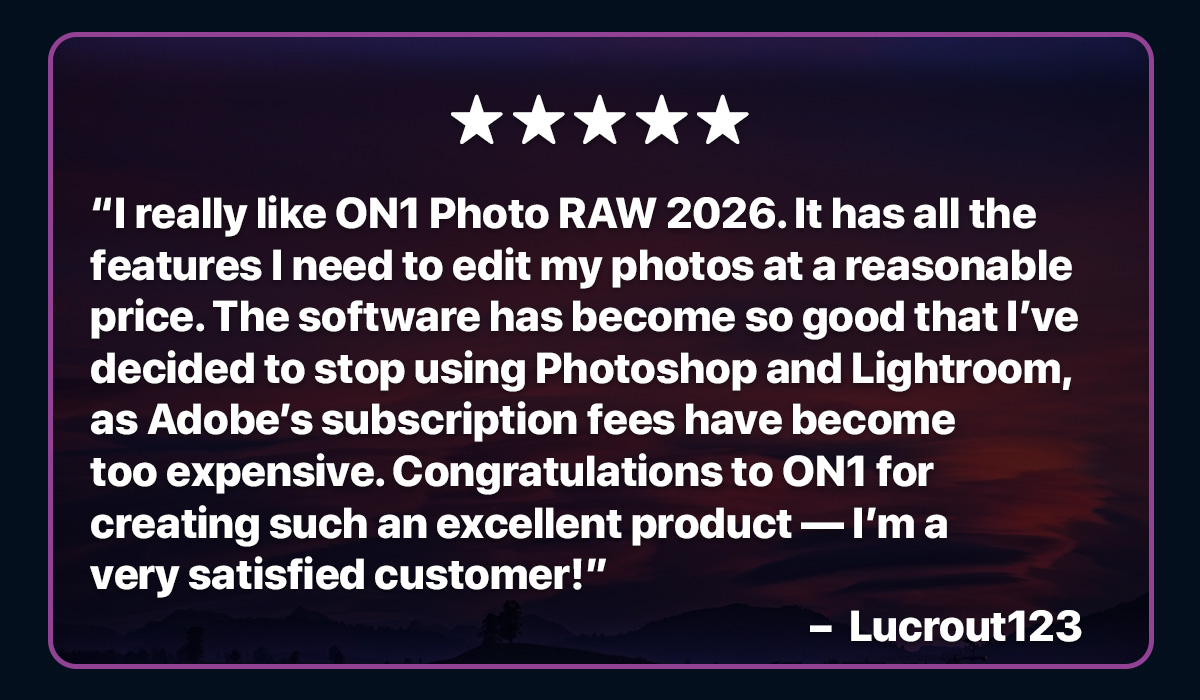 ON1 Photo RAW 2026 provides all the tools photographers need in one elegant editor. It's like having Photoshop and Lightroom in a single app, but it's far easier to use, more fun to edit, and doesn't require a subscription. It's fast, intuitive, and built for photographers who want control over every detail. Best of all,
