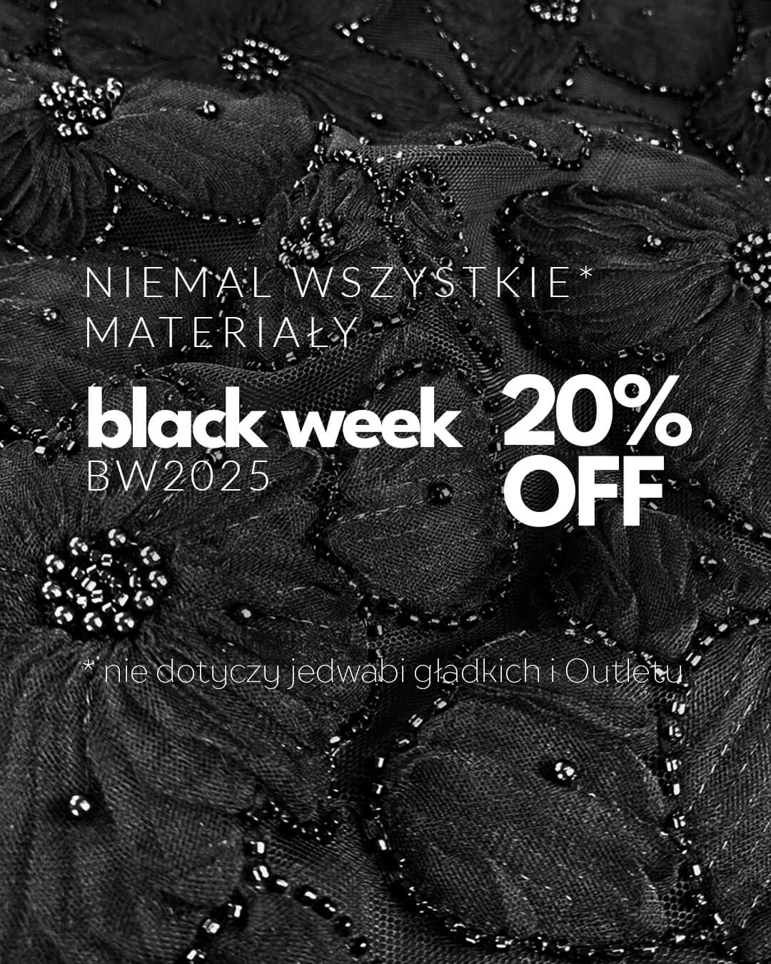 Rozpoczynamy Black Week ! • 20% rabatu na niemal wszystkie* tkaniny (* z wyłączeniem Jedwabi gładkich i Outletu) • Wysyłka GRATIS przy zakupach powyżej 500 zł • Tkaniny są oznaczone flagą BW2025. Nie trzeba wpisywać kodu – ceny są już przeliczone. • Czas trwania do 1 grudnia 2025 do północy