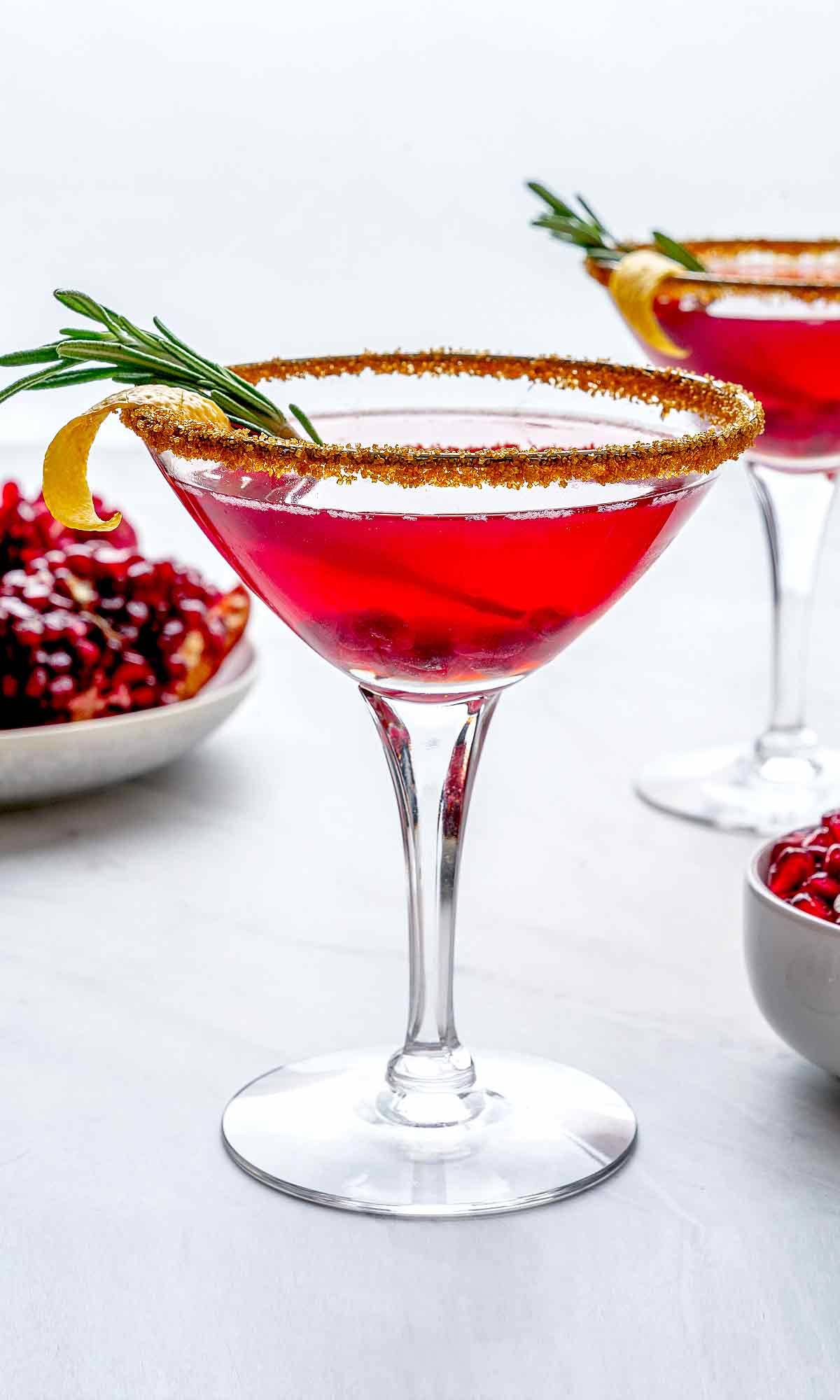A gold sugar rim, fresh pomegranate arils, and a stir stick that's fresh and fragrant (a sprig of rosemary), all make this Christmas martini festive and bright.