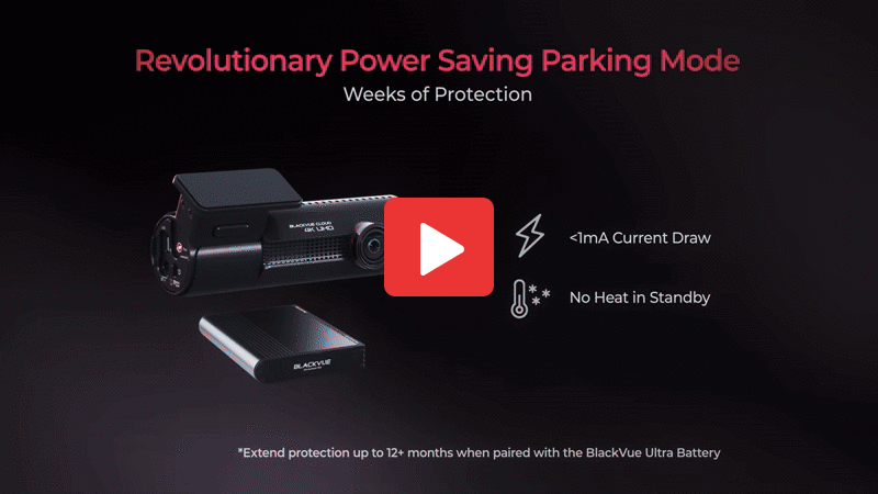 - Consumes less than 1 milliamp of current—it won't drain your car's battery and can run for weeks on a new battery, or up to a year with the dedicated BlackVue Ultra Battery (B-130A). - Generates virtually no heat, making it perfect for running in hot parked cars without shutting down. - Fast Boot feature allows it to start recording an Event in less than 1 second after an impact is detected.