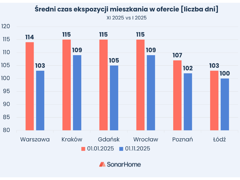 • W 2025 roku średni czas, przez jaki mieszkania pozostają na rynku sprzedaży mieszkań, skrócił się we wszystkich największych miastach Polski.