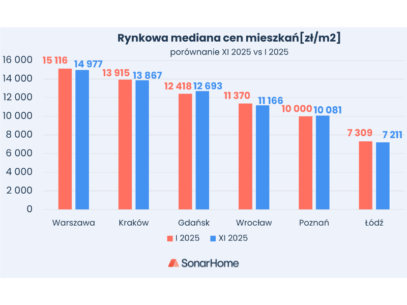 • Według danych SonarHome, w trzech spośród sześciu największych miast w Polsce – Warszawie, Krakowie oraz Poznaniu – zmiana mediany cen mieszkań od stycznia 2025 r. nie przekroczyła poziomu 1%.