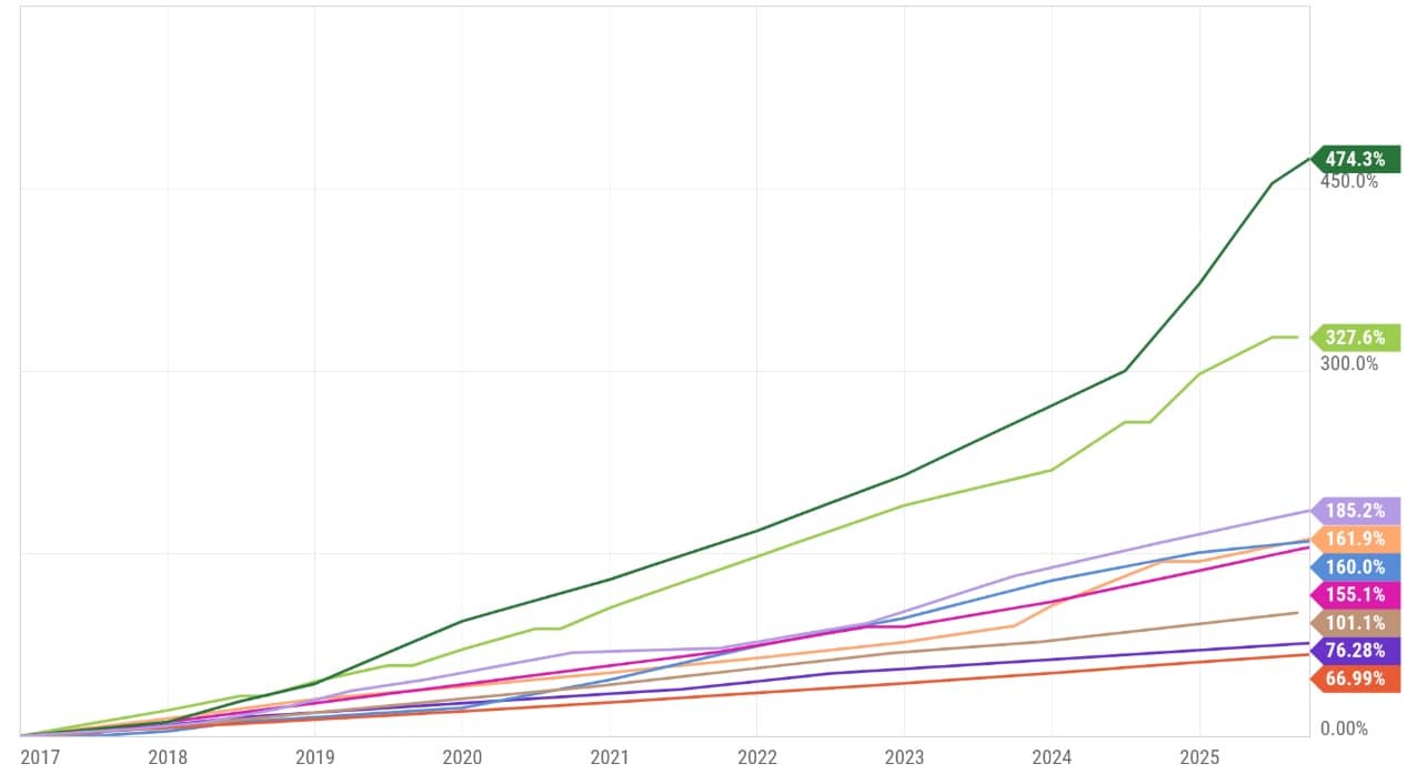 Source & Notes: Ycharts, data from 1/1/2017 through 12/18/25. One security is not shown because it paid a negligible dividend and then increased it by more than 10x in this time period, which throws off the image above.