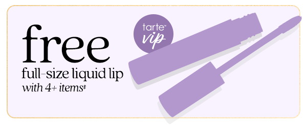 ‡Free mystery lip with 4+ item purchase is valid only on tarte.com for logged-in tarte™ VIP members. To qualify, add at least 4 items to your cart. The free gift will be automatically added to eligible carts. Gift is preselected and cannot be substituted or exchanged - selection may vary by order. Limit one mystery lip per order. Offer applies to in-stock items only and is valid while