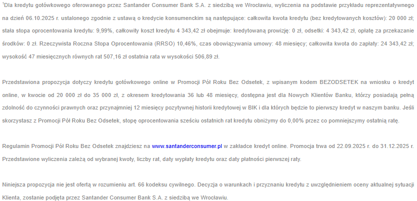 Kampania realizowana na zlecenie: Santander Consumer Bank S.A. z siedzibą we Wrocławiu, ul. Legnicka 48 B, zarejestrowany w Krajowym Rejestrze Sądowym przez Sąd Rejonowy dla Wrocławia-Fabrycznej, VI Wydział Gospodarczy Krajowego Rejestru Sądowego pod numerem KRS 0000040562, o kapitale zakładowym wpłaconym w całości w wysokości 520.000.000,00 zł, REGON: 012736938, NIP: 527-20-46-102