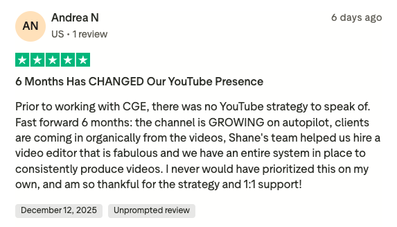 Fast forward to today: her channel is growing on autopilot, and clients are coming in organically from her videos — without chasing views, AdSense, or burnout.