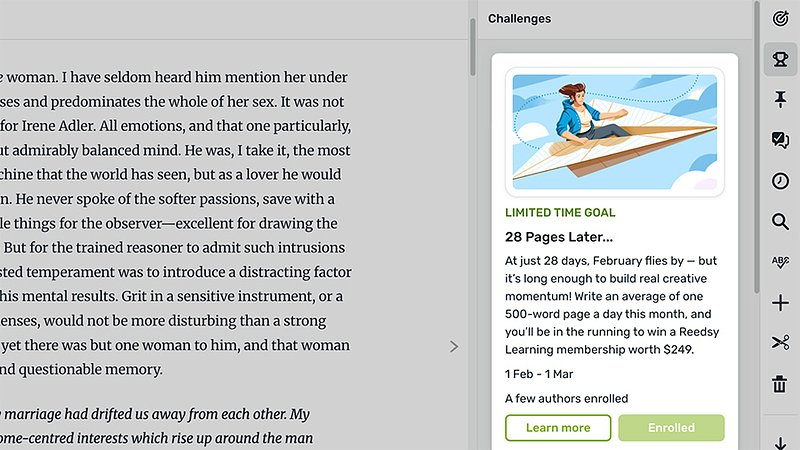 How it worksSimply join the challenge in Reedsy Studio and write 14,000 words in the app by the end of February. That’s it! No judging, no pressure.