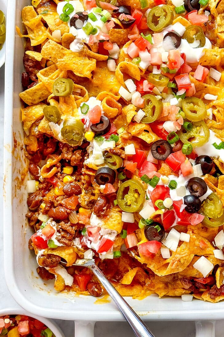 First up: Frito pie! It's the ultimate comfort food dinner or game day app made by loading up Fritos corn chips with taco-seasoned chili and lots of cheese.