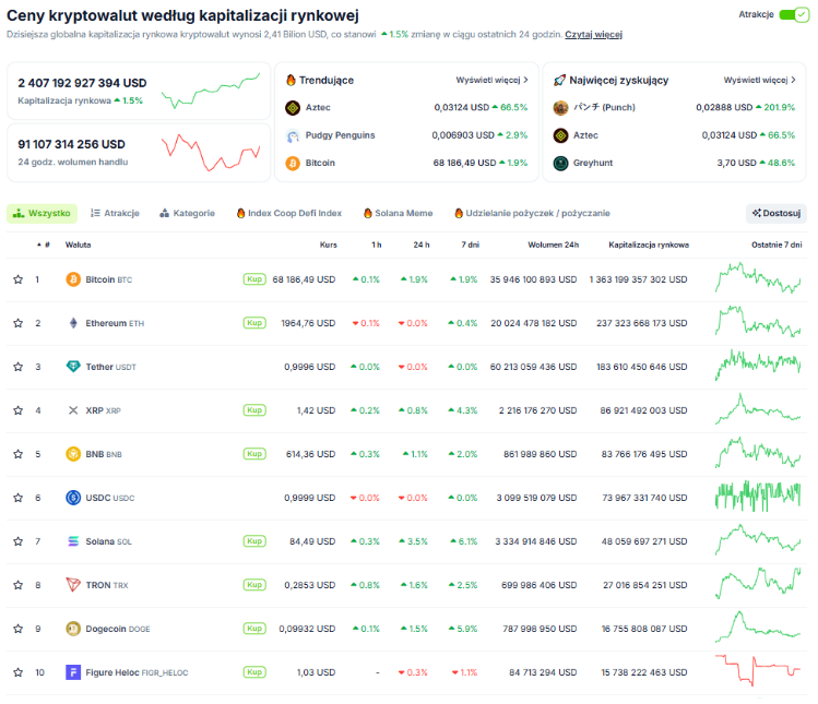 Bitcoin utrzymuje się w rejonie 68 100 USD, notując niewielki wzrost dobowy (ok. +1,9%) i podobną skalę wzrostu w ujęciu tygodniowym. Kapitalizacja BTC wynosi ok. 1,36 bln USD, co potwierdza utrzymującą się dominację oraz relatywną odporność na krótkoterminowe wahania. Obraz rynku sugeruje raczej konsolidację po wcześniejszych ruchach wzrostowych niż fazę dystrybucji.