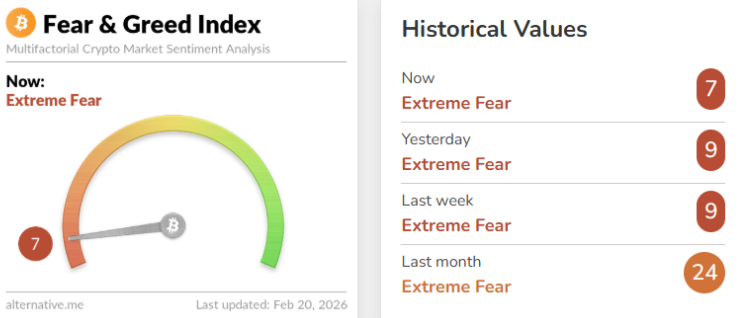 Aktualny odczyt Fear & Greed Index wynosi 7 punktów, co oznacza pogłębienie strefy skrajnego strachu. W porównaniu z wczoraj (9 punktów) oraz zeszłym tygodniem (również 9 punktów) widać dalsze pogorszenie nastrojów — sentyment ponownie osuwa się w kierunku panicznych poziomów. To sygnał, że rynek nie tylko pozostaje w defensywie, ale wręcz narasta pesymizm i niepewność wśród inwestorów.