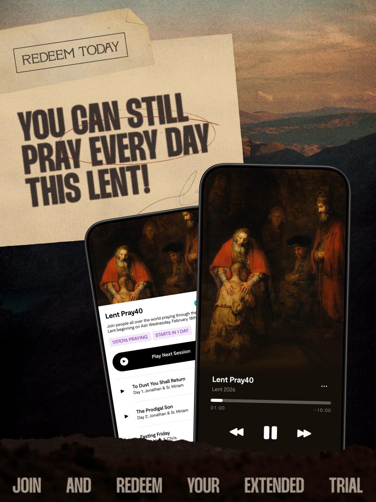 With more than 1,670,000 people praying together, it's not too late to jump in and start praying! There’s still time to take advantage of your limited-time 3-Month Extended Trial, which won’t last much longer. This special Lent trial gives you access to the Pray40 challenge and 10,000+ prayers, sleep meditations, courses, audiobooks and much more that’ll help you build a habit of daily prayer this Lent.