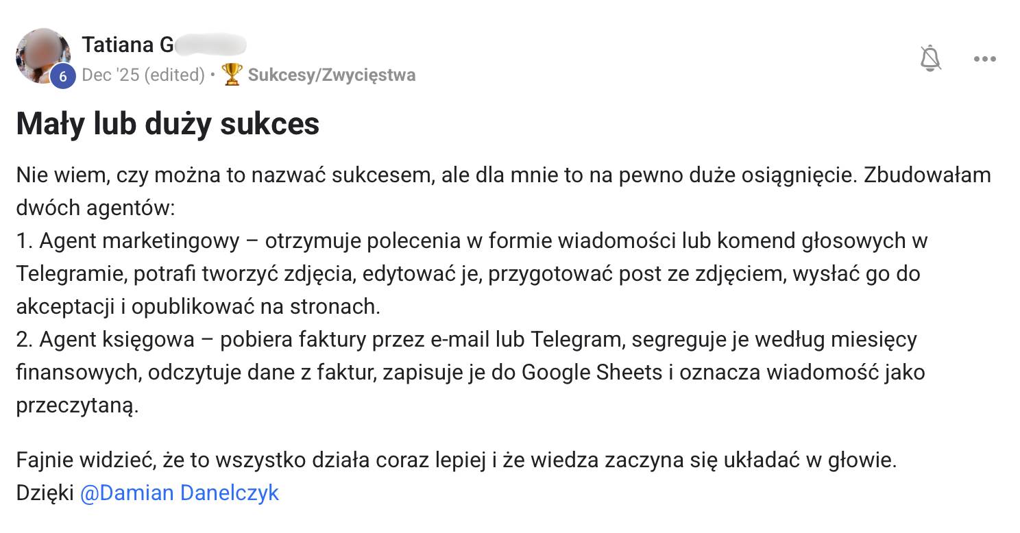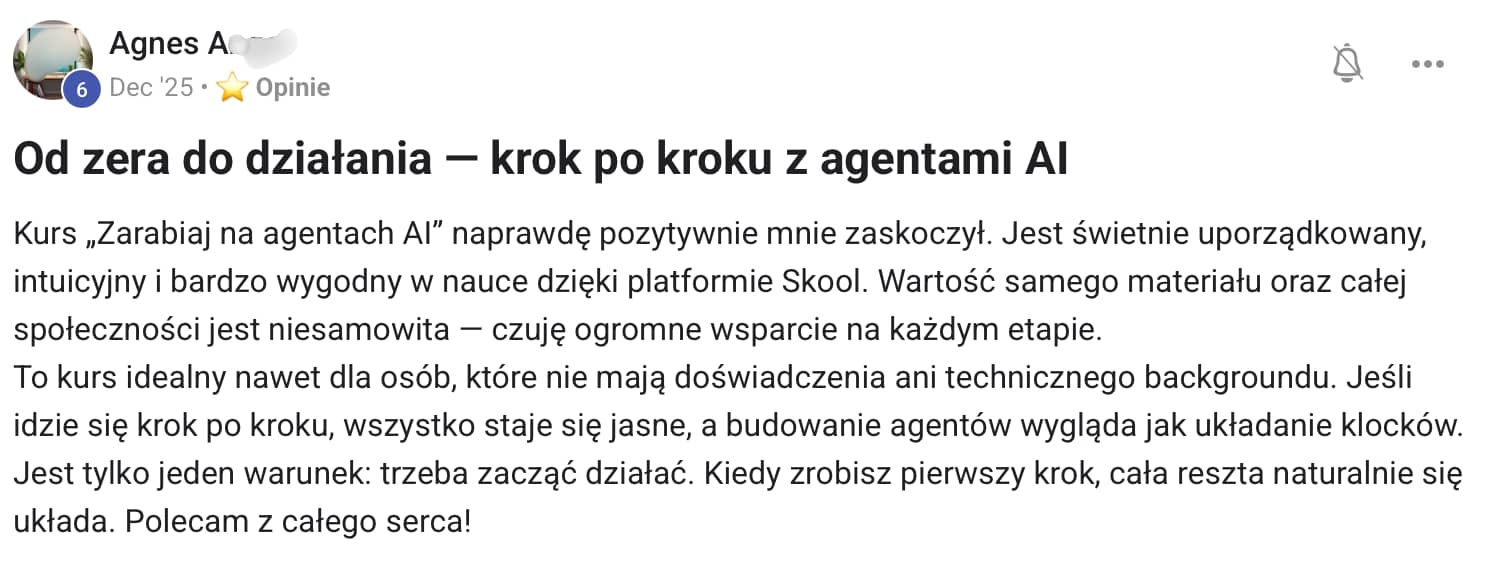 Cześć Janusz, Dzisiaj zamykamy zapisy do programu "Zarabiaj na Agentach AI od ZERA". Ale zanim zacznę mówić o ostatniej szansie — muszę Ci coś pokazać. Bo większość osób, które teraz są w programie, na początku myślała to samo co Ty. "To pewnie scam." Wiem, bo cały czas dostaję takie wiadomości. I wiesz co? Nie przejmuję się nimi. Dlaczego? Widzę ludzi, którzy wchodzą niepewni — a po tygodniu budują swojego pierwszego agenta. Widzę wiadomości "kurde, czemu nie zacząłem pół roku temu." Mało kto prosi o zwrot. A jak już ktoś prosi — to zwykle z powodów osobistych. Brak czasu, zmiana planów. Nie dlatego, że program nie działa. Zresztą — nie musisz mi wierzyć na słowo. Poniżej wrzucam screeny od osób z programu. Przeczytaj je. To nie są aktorzy. Nie są opłaceni. To ludzie, którzy byli dokładnie tam, gdzie Ty jesteś teraz" 80% z nich nie miało doświadczenia z programowaniem. Ludzie po studiach humanistycznych. Marketingowcy. Właściciele małych firm. Osoby z korpo, które miały dość. Weszli sceptyczni. Zostali, bo zobaczyli wyniki. Bo w tym programie nie jesteś sam. Masz społeczność praktyków - ponad 1 300 osób! I ludzi, którzy przechodzą tę samą drogę obok Ciebie. Ci ludzie ze screenów? Kilka miesięcy temu myśleli "to scam." Dziś budują agentów i sprzedają je firmom. Pytanie — czy za kilka miesięcy będziesz jednym z nich? DOŁĄCZ DO PROGRAMU PRZED 22:00 >> Mam nadzieję, że widzimy się w programie, P.S. Pamiętaj, że to ostatnia edycja w takiej cenie. Nie wiem kiedy będzie kolejna edycja. Na pewno będzie droższa. Ta strona wygasa po 22:00. |