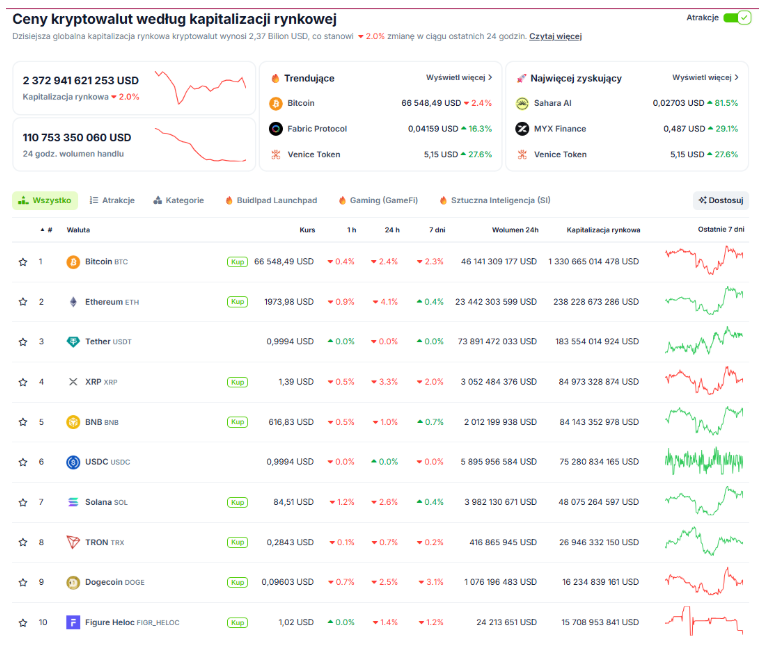 Bitcoin notowany jest w rejonie 66,5 tys. USD, tracąc ok. 2–2,5% w ujęciu dobowym. Kapitalizacja BTC utrzymuje się powyżej 1,33 bln USD, co potwierdza jego dominację, choć krótkoterminowo widoczna jest presja sprzedażowa. Obraz sugeruje raczej fazę konsolidacji pod oporem niż próbę powrotu do dynamicznych wzrostów.