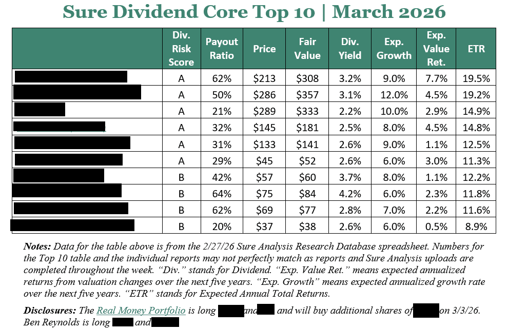 All 10 of these securities are analyzed in detail in the brand new March 2026 edition of the Sure Dividend Core Newsletter that we just published this morning (3/1/26).