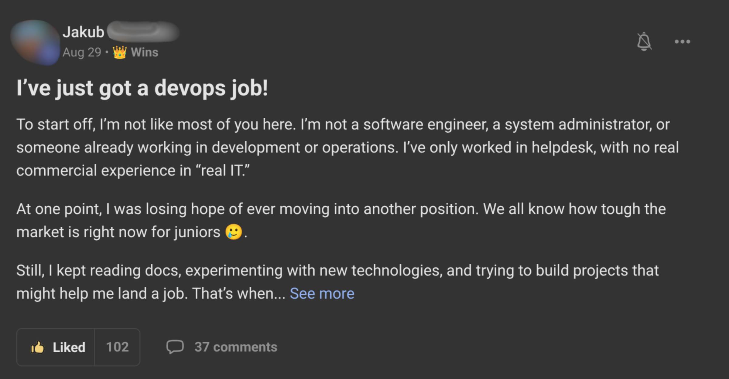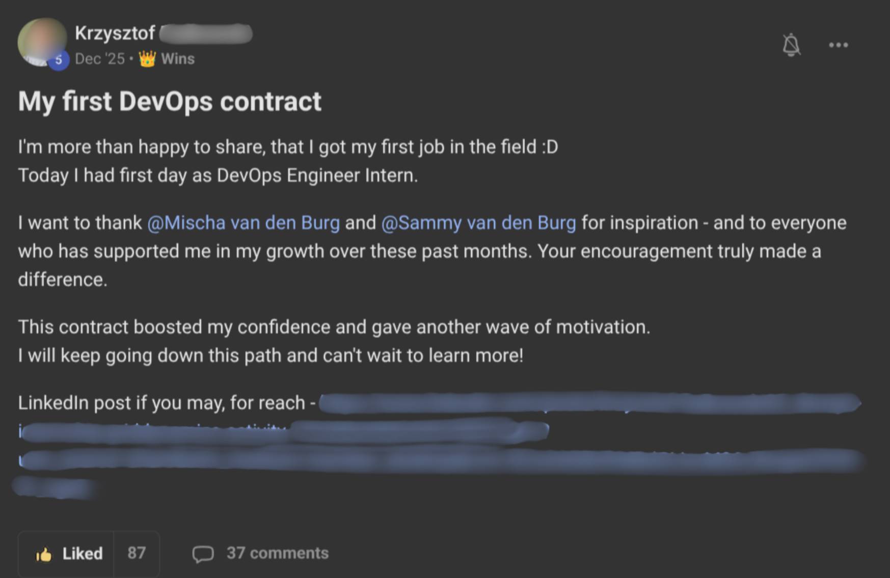 “I’m not from real IT” is usually code for “I haven’t yet done the kind of work that makes me believable.” We fix that by making you someone who can walk an interviewer through real systems you built yourself. Objection 2: “I’m too junior / I don’t have any experience”Krzysztof wasn’t sitting on years of cloud experience. He was still working his way in when he joined KubeCraft. He went through the material, built his skills, and kept showing up. Result: he landed his first DevOps Engineer internship contract. His words: “I’m more than happy to share that I got my first job in the field. Today I had my first day as DevOps Engineer Intern… This contract boosted my confidence and gave another wave of motivation. I will keep going down this path and can’t wait to learn more.” Companies didn’t hire him because he’d been doing DevOps for 10 years. They hired him because: