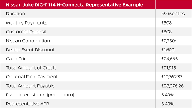 1 Nissan Juke Petrol N-Connecta: £21,915 applies to retail customers. Original OTR is