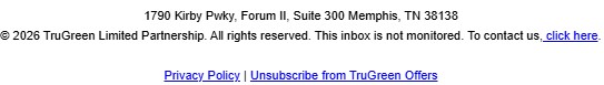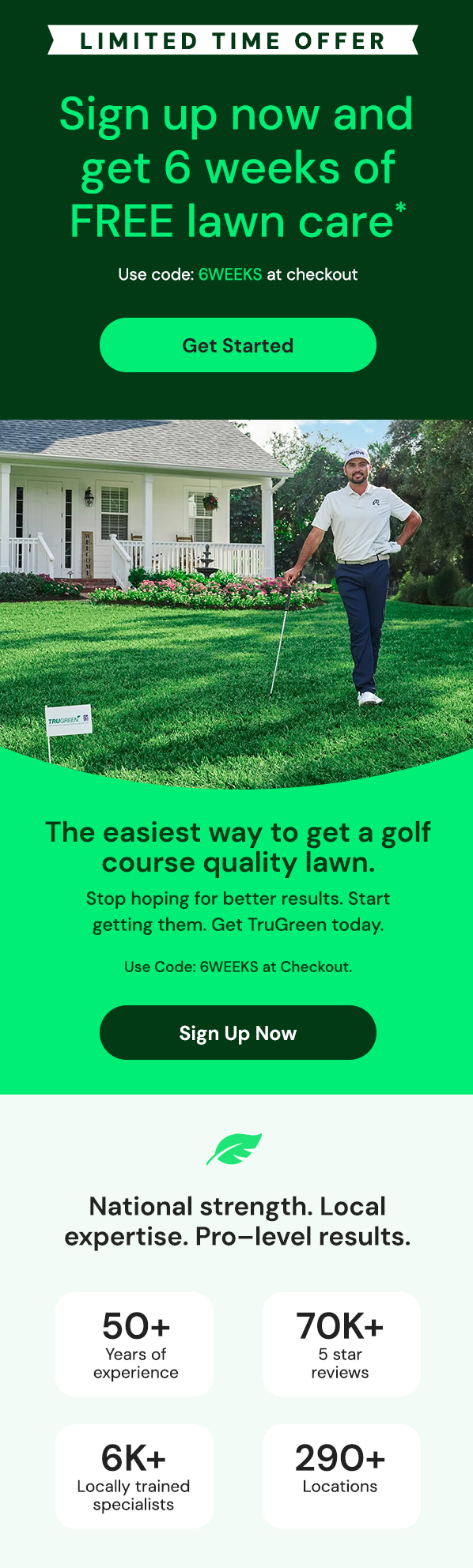 *Six (6) weeks of free lawncare based on average time between recurring lawn care services. In dividu al application cadence may vary. Offer valid o n the final regular lawn application in the first twelve (12) months of your plan. Use code 6WEEKS. Only applicable on new, full program residential Lawn plans purchased between 3/15/2026 - 4/7/2026. Offer unavailable for lawns larger than 20,000 square feet. Not valid on TruBasic or partial programs. For residential EasyPay or PrePay customers only. Purchases outside of promotional period do not qualify. Valid at participating TruGreen locations. Availability of services and/or products may vary by geography. Not to be combined with or used in conjunction with any other Lawn offer or discount. Offer is non-transferable and may be removed if services are cancelled. Offer can not be reinstated after cancellation. Additional restrictions may apply. Consumer responsible for all sales tax.