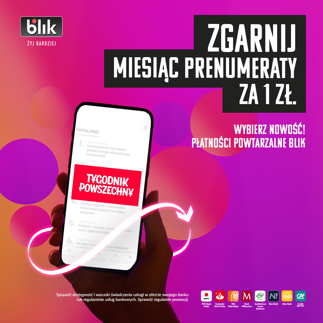 Zostajesz z nami, jak długo chcesz. Czytać „Tygodnik” możesz zacząć od razu – podpinasz BLIK, bez podawania danych karty, bez przelewów, i w kilkanaście sekund masz pełny dostęp do naszego serwisu. Pierwszy miesiąc z „Tygodnikiem” za złotówkę.