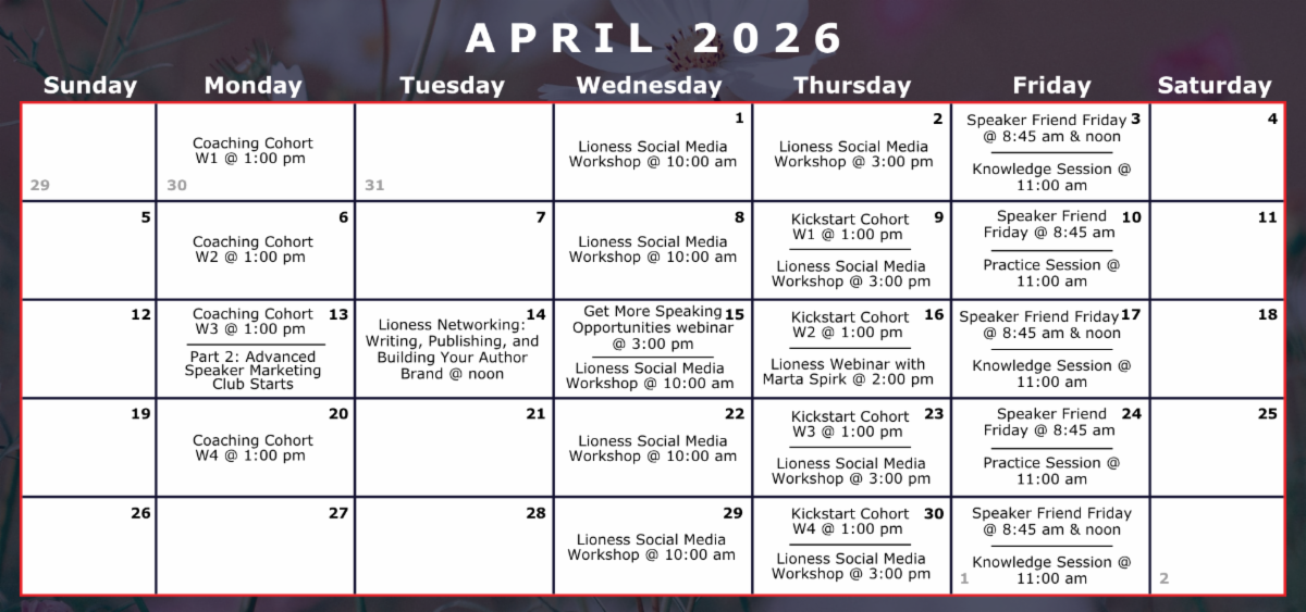 A new month means new opportunities to get in front of the right audiences, strengthen your speaking presence and stay connected to a community that’s here to support your growth.