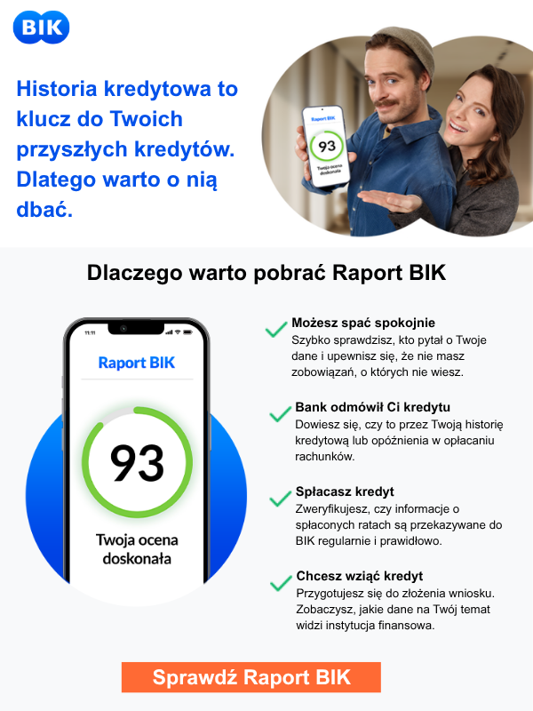 | Biuro Informacji Kredytowej S.A.; ul. Z. Modzelewskiego 77a; 02-679 Warszawa; KRS: 0000110015, Sąd Rejonowy m.st. Warszawy, XIII Wydział Gospodarczy, Kapitał zakładowy: 15.550.000 zł - opłacony w całości; NIP: 951-177-86-33. |
