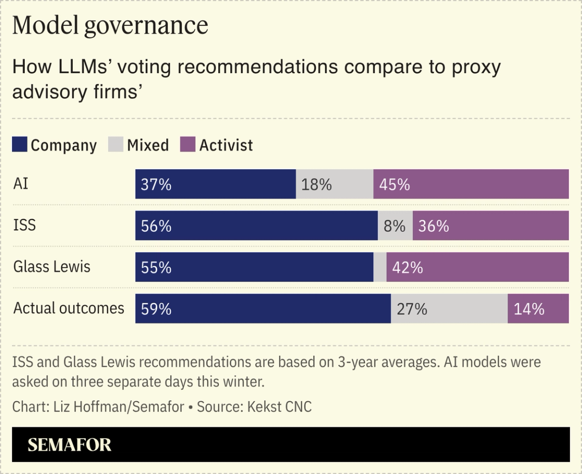 Corporate-comms firm Kekst CNC ran materials from 49 proxy contests that took place between 2023 and 2025 across four top AI models — ChatGPT, Anthropic’s Claude, Google’s Gemini, and Perplexity — and asked a simple question: Should investors back the activist or management? All favored the activist by wide margins, and were more friendly to those hedge funds than the leading (presumably human-forward) advisory firms ISS and Glass Lewis. But the models were also more likely to recommend compromise, which supports some recent research that shows LLMs nudge users toward consensus views.