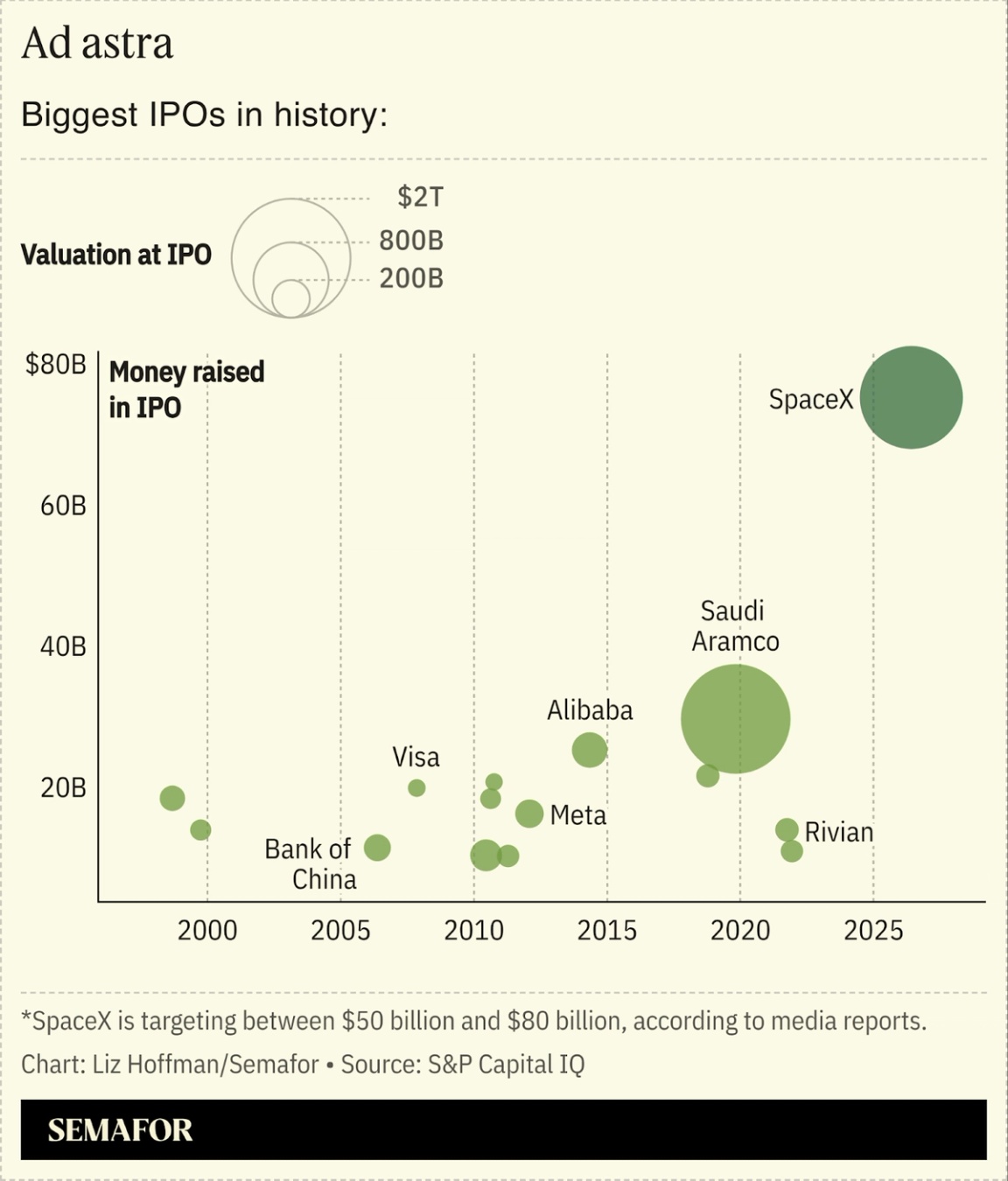 The giant sucking sound you’re going to hear this spring in the markets is banks assembling $75 billion of investors’ money to take SpaceX public. Elon Musk’s rocket company filed this week for an IPO that is expected to be three times bigger than the largest IPO on record — Saudi Arabia’s 2019 listing of its national oil company — and 350 times bigger than the average since 2000.