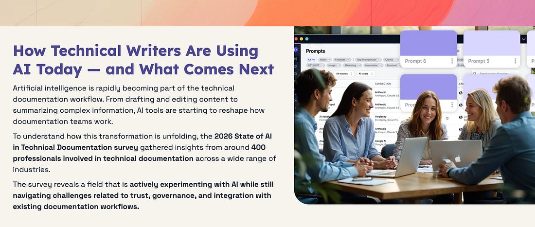 Want to Know What Technical Writers Are Actually Doing With AI? Start Here!Grab your free copy of the "2026 State of AI in Technical Documentation" report todayEverybody seems to have an opinion about AI in tech docs. Some people think it’ll save us. Others think it’ll replace us. Some appear to think that asking ChatGPT to rewrite a paragraph is the same thing as having an AI strategy, which is adorable in its own way, but not a reality. That’s why the 2026 State of AI in Technical Documentation report is worth a look. The report offers a useful overview of the findings, including how technical writers are using AI currently, which tasks they support with it most often, and where adoption is still getting hung up on entirely reasonable concerns like trust, governance, and integration. The findings are based on responses from around 400 technical documentation pros, and nearly half of those respondents have more than 21 years of experience in the field. In other words, this is not a pile of hot takes from people who discovered documentation last Thursday. The overview makes one thing clear: AI use is no longer theoretical for technical writers. A large majority of respondents report using AI either regularly or occasionally, with current use concentrated around editing, drafting, rewriting, and summarizing content. At the same time, interest is growing in more operational uses, such as metadata tagging, content classification, terminology work, and content reuse. That gap between what teams are doing now and what they want to do next is where the interesting story lives. Which is why the full report matters. The summary gives you the headlines. The full report gives you the texture, the context, and the evidence you’ll want when somebody at work says, “So what should our documentation team be doing with AI?” It’s much nicer to answer that question with research than with the professional equivalent of shrugging in business casual. If you work in tech docs and you’re trying to separate signal from nonsense, request the free report. You're currently a free subscriber to The Content Wrangler. For the full experience, upgrade your subscription. |