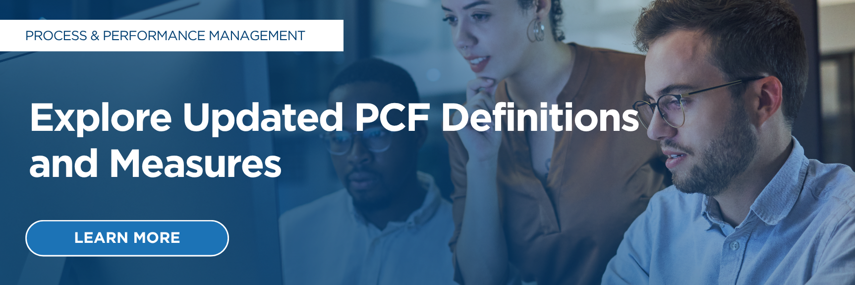 The APQC Process Classification Framework (PCF) ® 8.0 has been enhanced with updated definitions and recommended measures—helping you better understand, manage, and improve your processes. These resources provide clear, standardized definitions for each process element, along with key performance indicators (KPIs) to help you: |