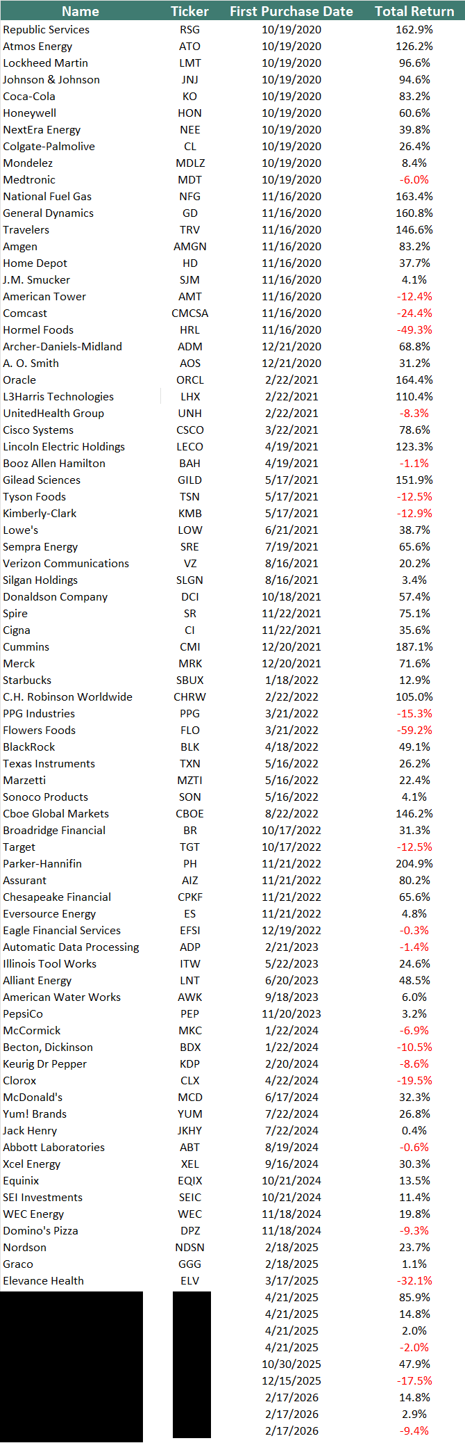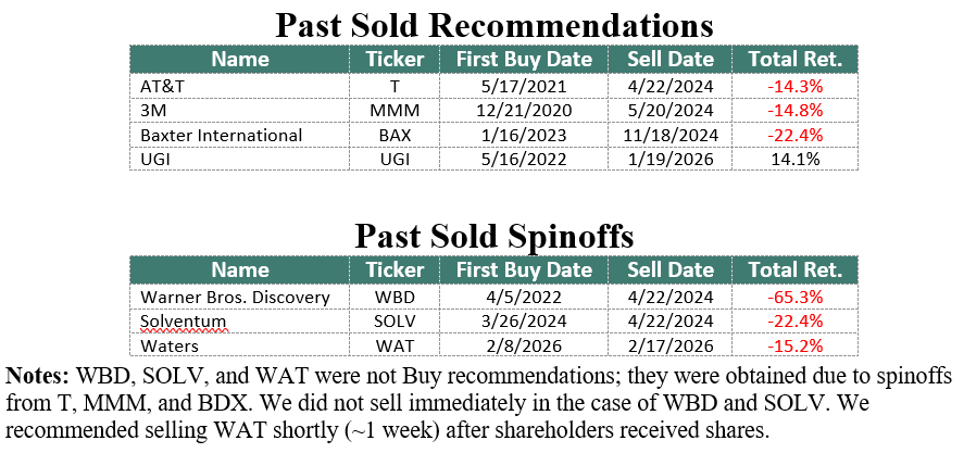 Sold Past Recommendations & Sold Spinoffs Our only sell rule is to sell when a stock breaks its streak of consecutive annual dividend increases, by: