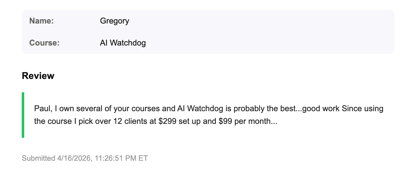 Quick Cash Vault is brand new. I just released it today. So no, I can't show you results from THIS course yet... But here's what Gregory said after going through one of my other courses: "I own several of your courses and AI Watchdog is probably the best... since using the course I picked up over 12 clients at $299 setup and $99 per month." And Emmanuel, after going through another one: "This course delivered incredible insight... I've been able to close deals faster, tighten up my pitching process, and generate real revenue. That's exactly why I keep coming back." People keep coming back because the methods work. Quick Cash Vault is no different. 3 proven methods. Step-by-step training. Process maps. Real case studies. Everything you need to go from zero to cash in hand — in as little as 4 hours. And right now it's only $15. That's the launch price and it's going away soon. |