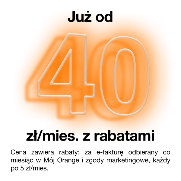 Oferta dla klientów przenoszących numer online do oferty abonamentu komórkowego z Planem XS z umową na 24 mies. (od 40 zł/mies. z rabatami, od 25. mies. co roku kwota abonamentu wzrośnie o 10 zł, a od 37. mies. o kolejne 5 zł co rok; aktywacja 60 zł) Cena z rabatami: za e-fakturę, odbieranym co miesiąc w Mój Orange i za zgody marketingowe, każdy po 5 zł/mies. oraz przez pierwsze 24 mies. rabat 5 zł/mies. za zakup online. Oferta na 17.04.2026 r. Szczegóły na orange.pl Oferta ograniczona terytorialnie. Adres do korespondencji: Orange Polska S.A., ul. Jagiellońska 34, 96-100 Skierniewice www.orange.pl/kontakt. Orange Polska Spółka Akcyjna z siedzibą i adresem w Warszawie (02-326) przy Al. Jerozolimskich 160, wpisana do Rejestru Przedsiębiorców prowadzonego przez Sąd Rejonowy dla m. st. Warszawy XII Wydział Gospodarczy Krajowego Rejestru Sądowego pod numerem 0000010681; REGON 012100784, NIP 526-02-50-995; z pokrytym w całości kapitałem zakładowym wynoszącym 3.937.072.437 złotych. Wysyłka realizowana na zlecenie Orange Polska S.A. z siedzibą w Warszawie, adres: 02-326 Warszawa ul. Aleje Jerozolimskie 160, zarejestrowana w Sądzie Rejonowym dla m. st. Warszawy XII Wydział Gospodarczy Krajowego Rejestru Sądowego pod numerem KRS 0000010681, o kapitale zakładowym 3.937.072.437 PLN (NIP 526-02-50-995). |