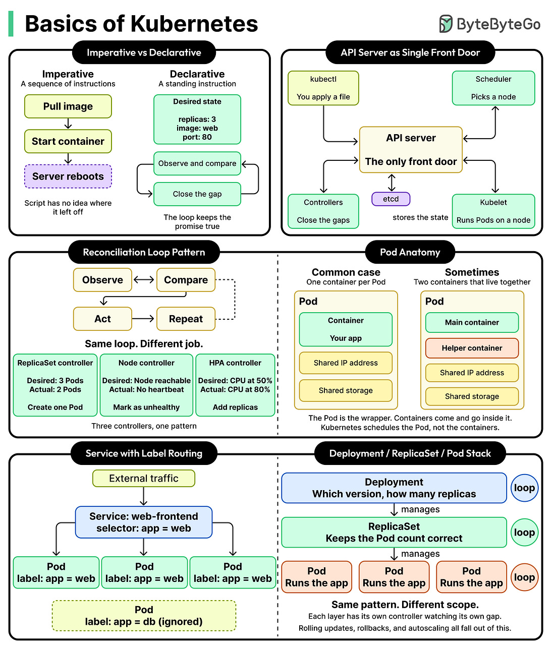 Latest articlesIf you’re not a subscriber, here’s what you missed this month. To receive all the full articles and support ByteByteGo, consider subscribing: Think about the difference between leaving a housemate a to-do list and writing them a contract. The to-do list says “buy bread on Monday, take out the bins Tuesday, water the plants Wednesday.” It’s a sequence of instructions, and if any step fails or gets skipped, the whole thing fails. The contract says something different. It says the kitchen should always have bread, the bins should never overflow, and the plants should never go three days without water. One is a script. The other is a promise, and somebody has to keep checking whether the promise is being kept. Kubernetes is what we get when that second approach is taken seriously and built into a whole infrastructure platform. In this article, we will learn how Kubernetes is a system of promises, and that every piece of it is a small program keeping one of those promises. The Kubernetes Approach... |