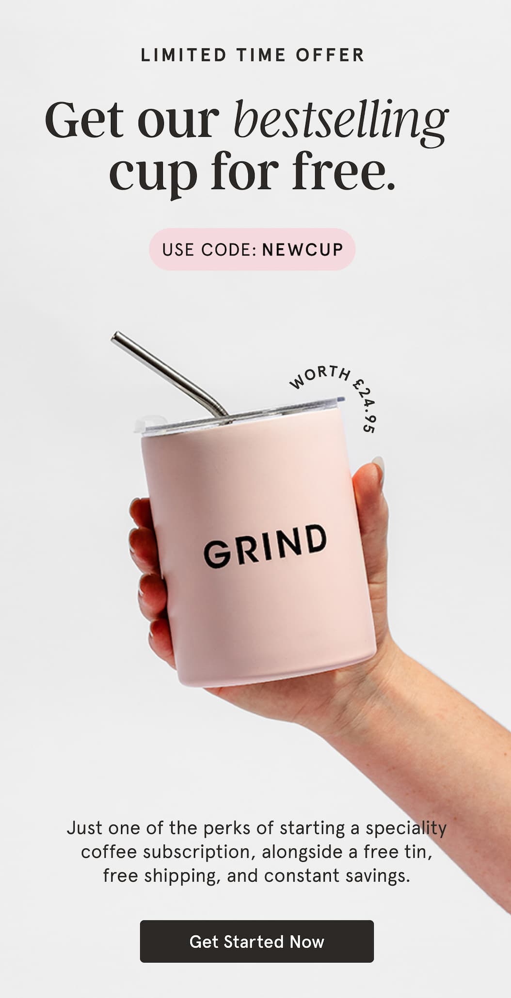 Our free cup offer applies to new subscription orders only, while stock lasts. A free Grind cup will be added to your basket when you purchase a subscription and use the discount code NEWCUP. This offer excludes existing subscription orders, gift subscriptions, gift cards, and one-time purchases, and cannot be combined with any other offer or discount. Offer applies to UK subscription orders only.