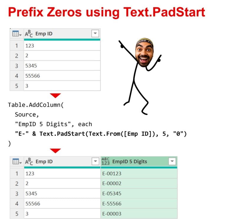 "E-" & Text.PadStart(Text.From([Emp ID]), 5, "0")