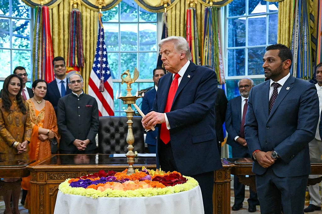 President Donald Trump lights candles as FBI Director Kash Patel looks on during a Diwali celebration with Indian American leaders in the Oval Office. (Andrew Caballero-Reynolds/AFP via Getty Images)