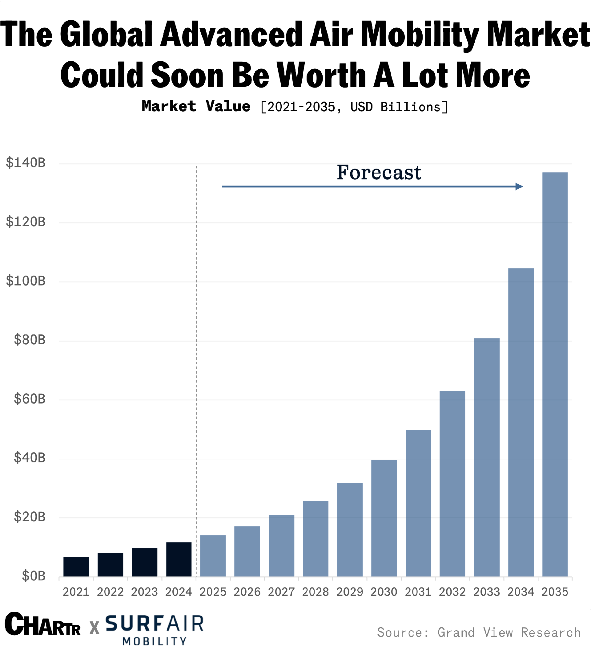Advanced air mobility is one of the fastest-growing segments within aviation. The global advanced air mobility market is forecast to be worth approximately $130 billion by 2035, growing at an estimated CAGR of 25.5% from 2025 to 2035.1