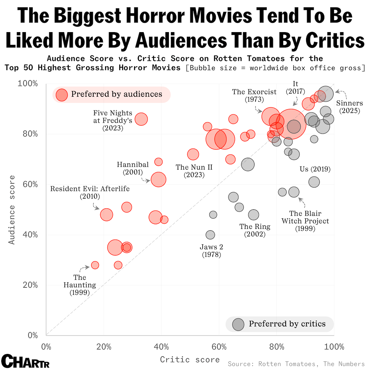 But when comparing the audience scores against critic scores on movie review site Rotten Tomatoes for the top 50 highest-grossing horror movies of all time, it’s clear that the general population actually often views popular scary movies more favorably than most professional reviewers. |