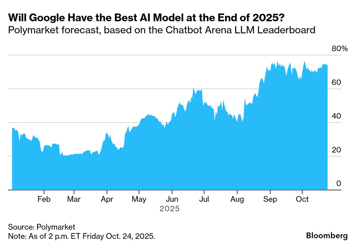 | How Good Will Google’s Next AI Model Be? Alphabet reports earnings this week, but there’s another potential milestone for the company on the horizon that’s worth watching. Traders on Polymarket put a 76% chance on Google releasing the next version of its Gemini AI model by the end of November. Given how much of the company’s — and the entire stock market’s — success now hinges on the AI boom, that release would be a major check in on AI progress. Both Polymarket and Kalshi think Alphabet will likely end the year with the best AI model, at least by one commonly cited leaderboard. But even if that’s true, Gemini’s next release – like OpenAI’s underwhelming release of GPT-5 and Anthropic’s quieter release of Claude 4.5 – could raise questions about whether today’s AI can keep improving, or whether it’s running into the limits of scale. (Right now, these companies’ models are, broadly, neck and neck – with different ones topping different leaderboards.) For Alphabet, the big question is how Gemini compares to its rivals. But for the market’s broader AI frenzy, it’s whether the pace of AI progress is slowing down. (Forecasts as of 2 p.m. Friday Oct. 24.) Bonus Rapid-Fire Forecasts: (As of 1:45 p.m. on Friday, Oct. 24.) | |