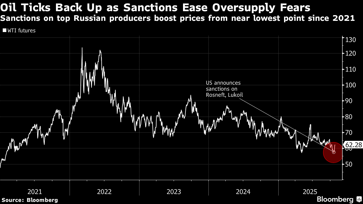 | Is the Oil Glut Here? Americans bogged down by rising costs were finally nearing a respite, as oil prices barreled toward lows not seen since the Covid-19 pandemic. That would mean cheaper prices at the pump, a central tenet of Trump’s economic agenda. With oversupply mounting and a Gaza peace deal easing risk to Middle Eastern supplies, oil’s slide looked unstoppable — until the White House slapped sanctions on Russia’s two largest oil producers, sending prices surging again. Two of the administration’s goals are now at odds: pressuring Russia and lowering prices for US consumers. So what’s next? While the threat of curtailed flows from Moscow, one of the world's largest producers, is a significant concern, many analysts and traders believe that they’ll be unlikely to outweigh the drag from oversupply. Since its invasion of Ukraine in 2022, Russia has been hit by numerous rounds of sanctions by Western countries and a price cap for the oil it sells, but the market has become adept at finding workarounds to keep that crude flowing. In the past, major buyers India and China have continued to scoop up barrels. This time there are signs of a slowdown, at least for now. If these flows remain intact and other top producers including Saudi Arabia and the US produce oil at their current pace, oil markets are poised to head lower. In addition, any indication that Russia may come to the negotiating table over ending the war in Ukraine could also send oil prices tumbling toward $50 a barrel. While the outlook is still uncertain, two things are clear in a low price environment: Depressed energy costs would be a welcome relief for American consumers who have been paying more for everything from groceries to electricity. On the other hand, sustained low oil prices will ramp up pressure on the economies of oil-reliant economies like Saudi Arabia and Russia and hurt the US shale industry. — Mia Gindis and Devika Krishna Kumar, Bloomberg News | |