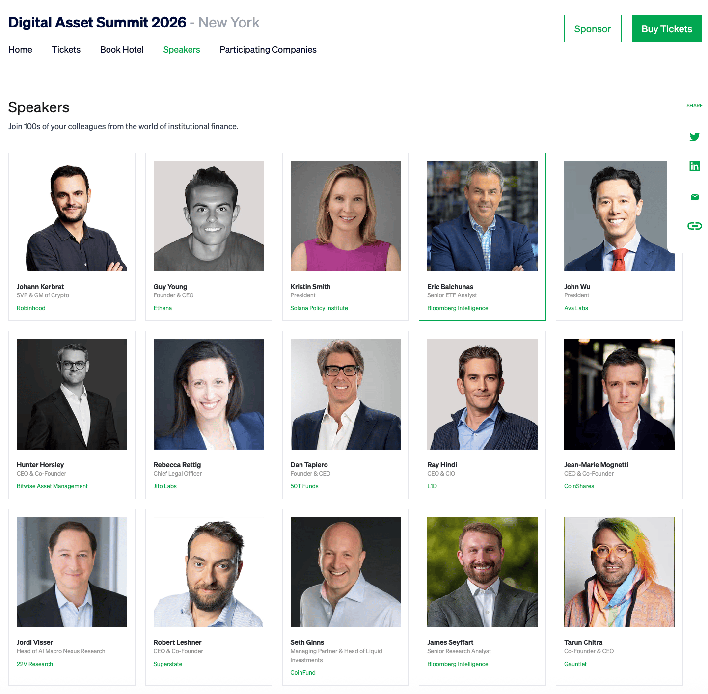 | DAS Stage is Set | 2025 was full of watershed moments for the institutional crypto world and 2026 will entail many more. DAS NYC 2026 will bring together the leading voices shaping the frontier of digital assets innovation. Hear from top executives & CEOs, legendary investors, and the builders who are unleashing institutional finance onchain. | Click Here to Explore the Full Lineup | | Why Attend DAS? | Networking: Connect with 150+ speakers and decision makers from top institutions, investment funds, and leading crypto infrastructure companies. Insights: Learn from experts innovating in payments, stablecoins, tokenization, market structure, risk, custody, and all things onchain finance. Experiences: DAS is famous for its world-class experiences, meals, and social events where you'll rub elbows with the best minds in the industry.