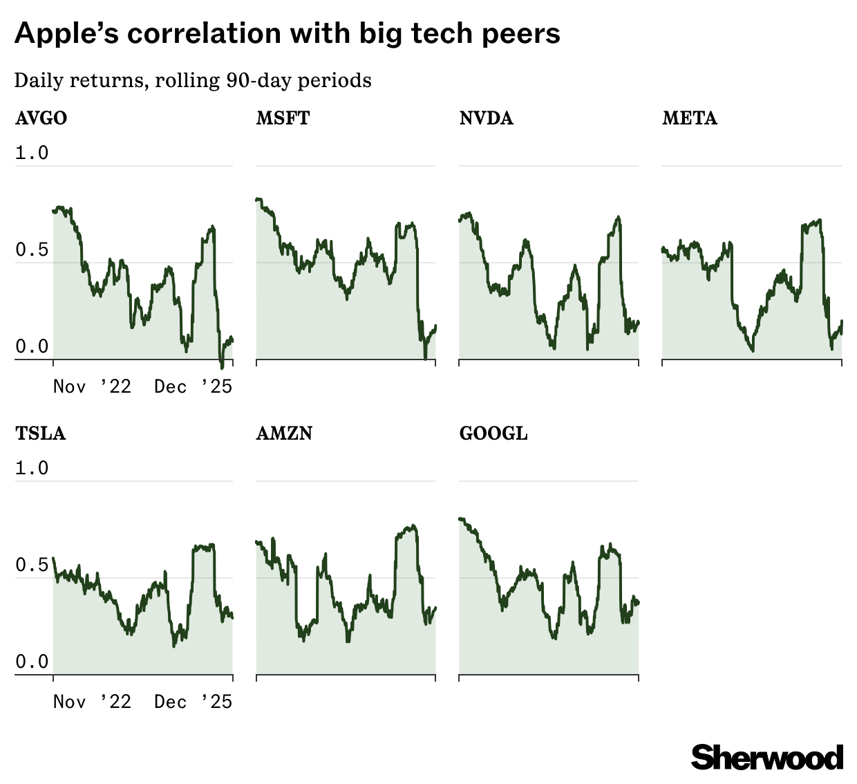 Apple is so bad at AI that its stock is increasingly detached from the rest of Big Tech. Some days that’s a blessing; on others, it’s a curse.