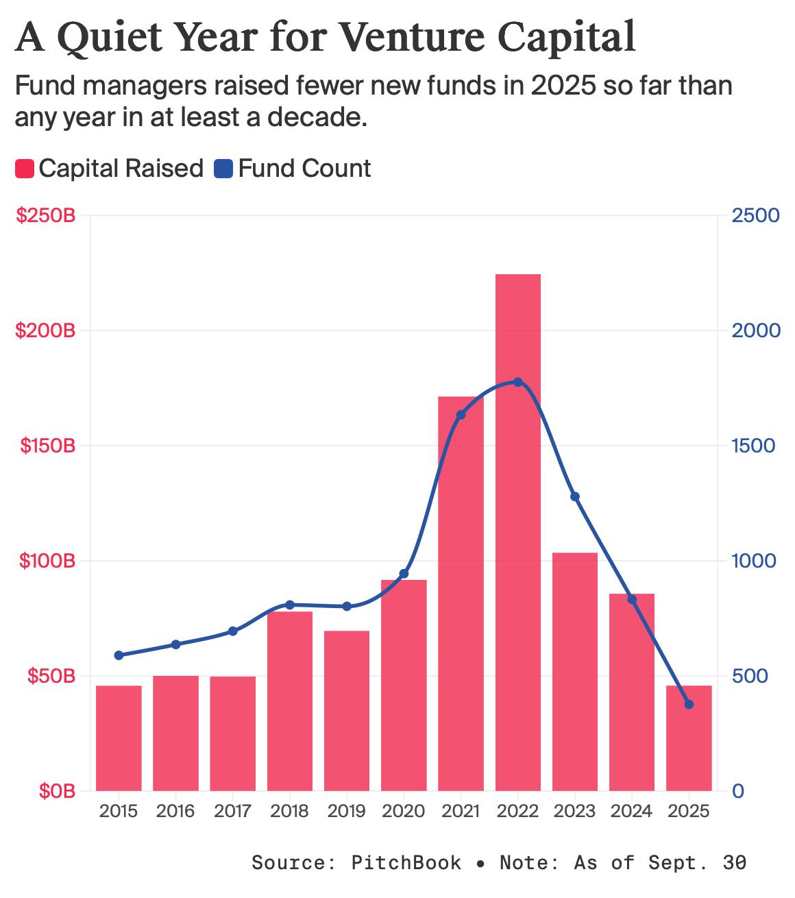The sky’s the limit for valuations for companies like SpaceX, but the venture firms writing the checks have less money in total to spend. Recent data from PitchBook shows how steep the decline in cash is. Fund managers raised $45.7 billion in new funds in the first nine months of the year. At that pace, fundraising is headed for the lowest level since 2017.  The number of new funds, meanwhile, is on track to be the lowest in at least a decade. There were just 376 new funds in the first nine months of the year, less than half of the 832 for all of last year and a steep drop from the 1,776 funds launched in 2022.
