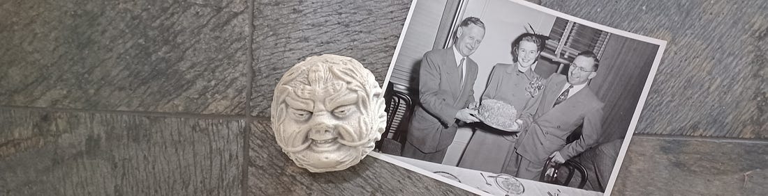 When A.I. Fiction Zigs, We ZagHere’s the concrete face I got for Christmas and can’t wait to embed in a stone wall somewhere deep in the woods. Let the moss grow, and someday a stranger will happen across this grimacing little guy and wonder… what does THIS mean?! It’s strange, the power of graven images. In my faux ruins, towering stone walls where I’ve embedded other faces and fragments of statuary, local kids have automatically gathered wild flowers and left them like offerings. At least I guess it’s kids. On occasion I simply find a wilted bouquet, or a necklace of flowers looped around an old, mossy face. Like pennies left on tombstones. Which Brings Us to… Harry Truman & a Cake?Is that Truman, the man who dropped the atom bomb? Going gaga over a coconut cake? It’s a big, studio 8-by-10 glossy, but with no explanation on the back. Whatever we scribble on the reverse side, it’s going to have to go into a good-sized book. Please, tell me what’s going on here? Who’s the pretty girl? Is this “cake” a secret weapon baked and ready to go into the Pacific Theater? Which Brings Us to the Brad, Chad & Plaid Challenge!Who Wore It Better…?MRKooper: “We just got matching tattoos.” Jake Gardner: “We always never talk about it.”¹ Maegan Heil: "You're not going to tell anyone about this, are you?" Rebecka DavisJohnson: “didn't even ask if he could barrow my shirt.”² Emory Willis: “How to get rid of fruit flies permanantly.”³ Mia Maeve: “We called it The Wisconsin.” Dan: “They did it.”⁴ Bryan Wiler: “WE SHOULD HAVE CALLED!” Peaky Progger: “Poor Becca.” Rick KC: “I still feel you inside me.”⁵ Martina Courtney: “He was enough.”⁶ And Our Winner Is:Maegan almost, almost won it. So close, but sad and tawdry takes the day. This week’s package goes to: Rick KC: “I still feel you inside me Rick, please contact The Cult and let me know how to inscribe your prize books, and where to mail them. For everyone else, please chime in below on the Cake Photo. Tell me what I’m NOT seeing in this lovely picture. In rereading The Shining this past week, I’m reminded how toward the end the hotel becomes a place where the past and present exist at the same time. Overlaid like “a bad double-exposure,” as it were. How can the style and language of your story reflect that idea? How can you collapse the past, present, and the future while still making sense? |