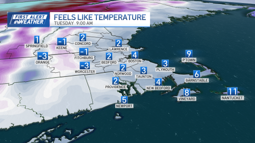 Numbing cold has returned for a one-day stand. Wind chills have dropped to the single digits above and below zero as winds continue to gust over 20 mph. Some of that wind will drop off in the mid/late afternoon, but we’re still be in the cold through Tuesday night. On Wednesday, the warmup will begin with a shift in the wind direction. While daytime highs stay in the upper 20s, we should move the needle into the 30s into the evening and late night. There may be some light mix or snow showers (with no/minor accumulation) into the overnight, then sun returns on Thursday. It’s then that we could pop into the low 40s before the arctic front arrives at night. Cold air funnels in on Friday as winds increase and sun holds on. While highs near freezing, we should see temperatures drop later in the day. We’ll continue to fall through Saturday as the bitter air seizes all of New England. Both weekend days will struggle to make the mid-teens. |